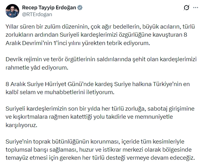 Cumhurbaşkanı Erdoğan, 8 Aralık Devrimi’nin 1. yıl dönümünde Suriye’nin özgürlüğüne mesaj ile destek verdi.