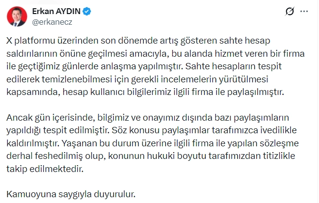 X platformu üzerinden son dönemde artış gösteren sahte hesap saldırılarının önüne geçilmesi amacıyla, bu alanda hizmet veren bir firma ile geçtiğimiz günlerde anlaşma yapılmıştır. Sahte hesapların tespit edilerek temizlenebilmesi için gerekli incelemelerin yürütülmesi kapsamında, hesap kullanıcı bilgilerimiz ilgili firma ile paylaşılmıştır.
