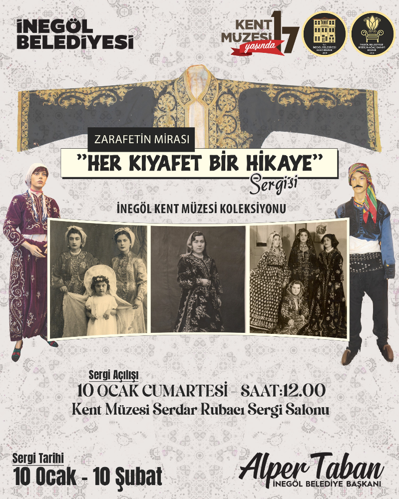 İnegöl Kent Müzesi, kuruluşunun 17’nci yılına özel olarak anlamlı bir sergiye ev sahipliği yapmaya hazırlanıyor. Her yıl kuruluş yıl dönümünü özel bir sergiyle kutlayan İnegöl Kent Müzesi, bu yıl “Zarafetin Mirası – Her Kıyafet Bir Hikaye” isimli sergiyle ilçe halkını buluşturacak. Sergi 10 Ocak Cumartesi günü saat 12.00’de İnegöl Kent Müzesi Serdar Rubacı Sergi Salonu’nda düzenlenecek açılışla görücüye çıkacak.