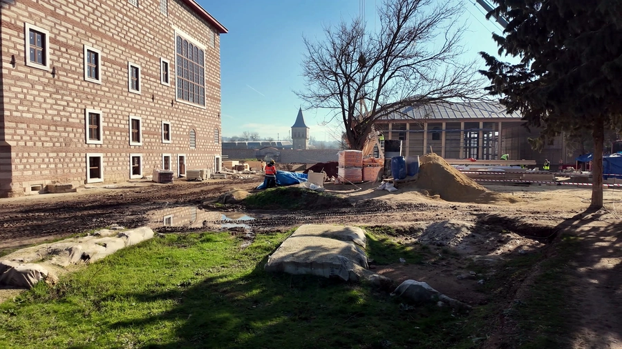 Sarayın sınırlarını oluşturan 500 metrelik avlu duvarlarının tamamlandığını anlatan Yıldız, “Sarayı Cedide Amire bölümünde yapılan çalışmalarda kum meydanı dediğimiz bölümde yaklaşık 500 metre sur duvarının kazı ve ihya çalışmalarını bitirdik. Bu, 3 yılın içinde kazı çalışmaları kurumumuzun oldukça önemli bir mesaisini aldı. Buradaki görmüş olduğunuz yapıların bugün ayakta olanlarının da büyük bir kısmı temel seviyesindeydi. Dolayısıyla Sarayı Cedide-i Amire de bundan sonraki aşamada önümüzdeki en önemli zorluk olarak karşımızda duruyor. İçinde bulunduğumuz alay meydanında görmüş olduğunuz gibi aynı bu arkadaki duvarlardan bu alay meydanında da bulunuyordu. Bunların belgeleme, plan, proje, arşiv, röle çalışmaları tamamlandı. Kazıyla desteklenen bölümlerinin ihyasına geçmek üzereyiz. Bu noktada içinde bulunduğumuz alay meydanını çevreleyecek ve Bab-ı Hümayun'la birlikte toplam 800 metre sur duvarının daha yapımına girişeceğiz. Aynı şekilde hemen arkada Cihannüma'nın arkasında yer alan Çeşme Meydanı da çalışmalarımızın bundan sonraki etabında yine sur duvarlarına kavuşacak bölüm olacak” diye konuştu.