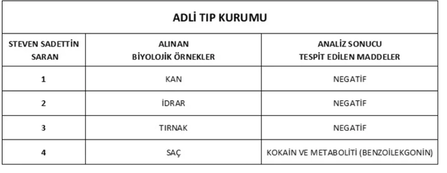 Hazırlanan raporda, Fenerbahçe Spor Kulübü Başkanı Sadettin Saran’ın saç örneklerinde uyuşturucu testinin pozitif çıktığı belirtildi. Saran’ın kan, idrar ve tırnak örneklerinde ise herhangi bir bulguya rastlanmadığı kaydedildi.