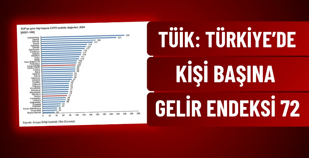 TÜİK, 2024 yılına ilişkin 'Satın Alma Gücü Paritesi' bültenini yayımladı. Satın alma gücü paritesi; ayrıntılı olarak tanımlanmış standart bir mal ve hizmet sepetinin farklı ülkelerdeki fiyat oranı olarak tanımlanıyor. Böylece ülkeler arasındaki fiyat düzeyi farklılıkları gideriliyor ve uluslararası anlamda gerçek fiyat ve hacim karşılaştırmaları yapılabiliyor. Avrupa Birliği İstatistik Ofisi (Eurostat) tarafından açıklanan SGP'ye göre; kişi başına gayrisafi yurt içi hasıla (GSYH) endeksi 2024 yılı sonuçlarına göre 27 Avrupa Birliği (AB) ülkesi ortalaması 100 iken, bu değer Türkiye için 72 oldu ve AB ortalamasının yüzde 28 altında kaldı. Karşılaştırmalarda; 27 AB üyesi ülke, 3 Avrupa Serbest Ticaret Birliği (EFTA) ülkesi (İsviçre, İzlanda ve Norveç), 6 aday ülke (Türkiye, Kuzey Makedonya, Karadağ, Sırbistan, Arnavutluk ve Bosna-Hersek) kapsandı. Karşılaştırmalarda yer alan 36 ülke arasında SGP'ye göre kişi başına GSYH endeksi en yüksek ülke 245 ile Lüksemburg, en düşük ülke 35 ile Bosna-Hersek oldu. Kişi başına GSYH endeksinde Lüksemburg AB ortalamasının yüzde 145 üzerinde, Bosna-Hersek yüzde 65 altında değere sahip oldu.