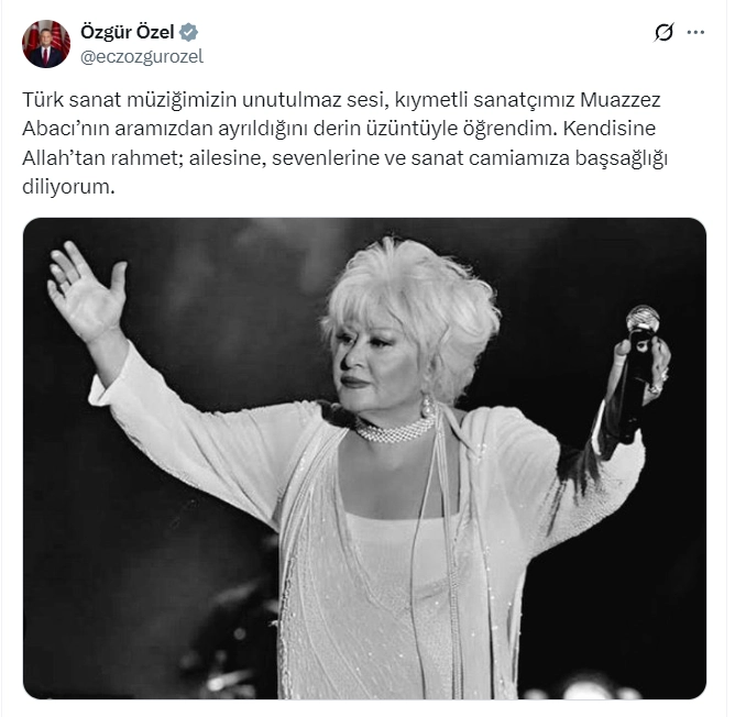 CHP Genel Başkanı Özgür Özel de Abacı’nın vefatından dolayı sosyal medya hesabı üzerinden yaptığı paylaşımda, “Türk sanat müziğimizin unutulmaz sesi, kıymetli sanatçımız Muazzez Abacı’nın aramızdan ayrıldığını derin üzüntüyle öğrendim. Kendisine Allah’tan rahmet; ailesine, sevenlerine ve sanat camiamıza başsağlığı diliyorum” dedi.