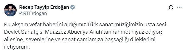 Cumhurbaşkanı Recep Tayyip Erdoğan, sosyal medya hesabı üzerinden taziye mesajı paylaştı. Cumhurbaşkanı Erdoğan, “Bu akşam vefat haberini aldığımız Türk sanat müziğimizin usta sesi, Devlet Sanatçısı Muazzez Abacı’ya Allah’tan rahmet niyaz ediyor; ailesine, sevenlerine ve sanat camiamıza başsağlığı dileklerimi iletiyorum” ifadelerini kullandı.